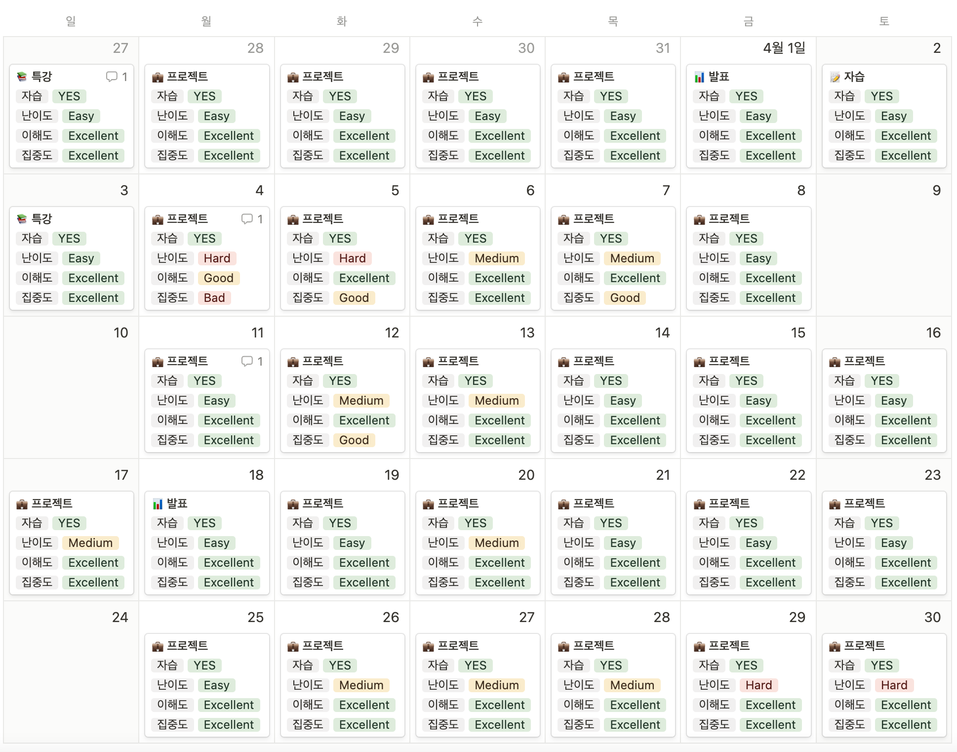 아마 난이도가 가장 궁금하신 내용일 것이라고 생각합니다. 전공자 기준으로도 전혀 쉽지 않은 다시말해 어려운 과정이었습니다. AI, 자연어처리는 진입장벽이 굉장히 높았습니다. 첫 1주일 파이썬을 공부하는데, 이미 파이썬 혹은 다른 언어가 어느정도 손에 익으신 분들이 보셔야 따라가실 수 있을 것입니다. 또한 이후 선형대수학, 머신러닝, 딥러닝, 자연어처리를 차례로 배우게 됩니다. 교육과정은 확실히 체계적이고 잘 만들어졌습니다. 하지만 내용을 못 따라가는 분들이 많았습니다. 오전 7시부터 3시간 동안 전날 내용을 복습하시고 오전 10시부터 오후 7시까지 수업 진행하시고 적어도 오후 11시까지 해당 내용을 복습하는 것을 추천합니다. (토요일에도 예외 없이 자습 추천드립니다.) 제 기준으로 목표는 오전 6시 기상 자정에 취침이었지만, 3시간 이상 못자는 날도 많았습니다. 그럼에도 모든 내용을 완벽하게 숙지하지 못했습니다...