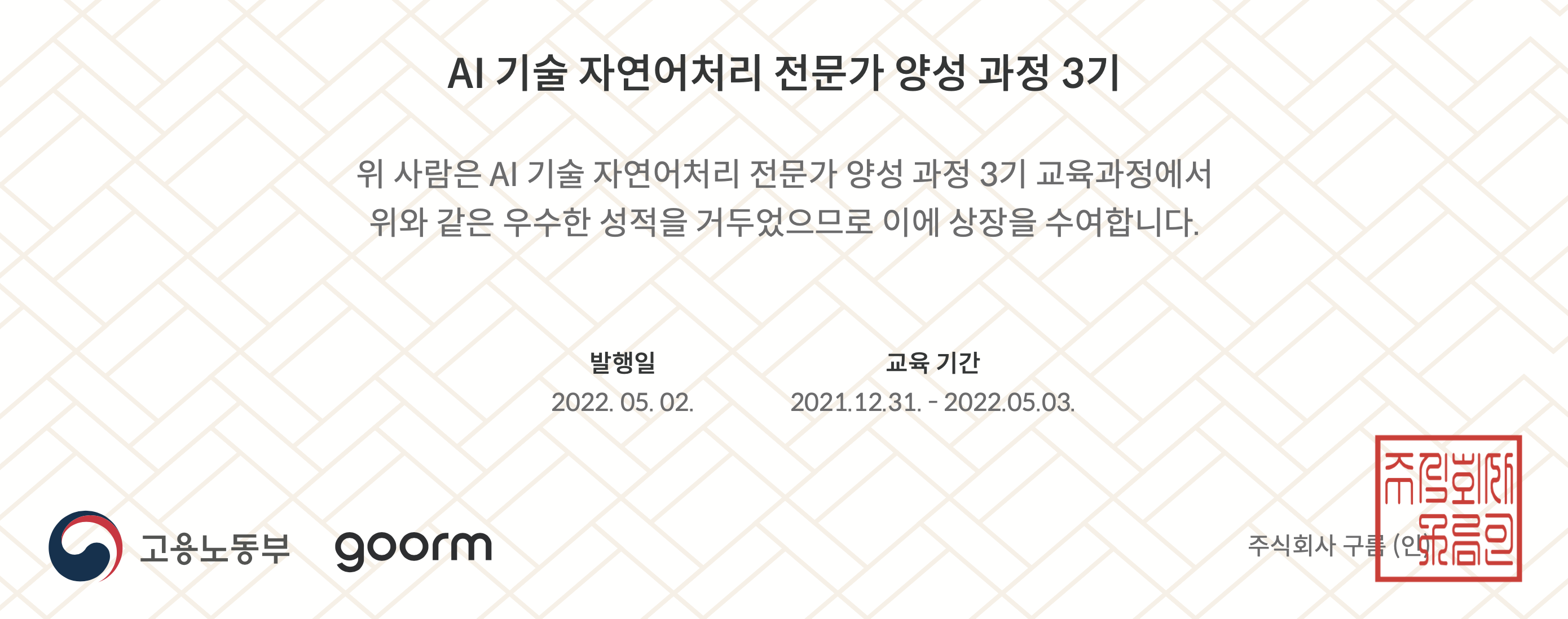 본 문은 지난 2021년 12월부터 2022년 5월까지 카이스트 AI 대학원 주재걸 교수님 연구실과 구름에서 진행하는 자연어처리 전문가 양성과정 3기를 수강한 후 작성하는 후기글입니다.