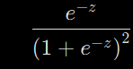 위에서 나온 $\sigma'(z)$를 정리하면 $\frac{\partial{\sigma(z)}}{\partial{z}} = \frac{e^{-z}}{(1+e^{-z})^2} = \frac{1}{1+e^{-z}} \times \frac{e^{-z}}{1+e^{-z}} = \sigma(z)\times \frac{e^{-z}}{1+e^{-z}} $ 가 되고, 여기서 $\frac{e^{-z}}{1+e^{-z}} $를 다시 정리하면 다음과 같습니다.