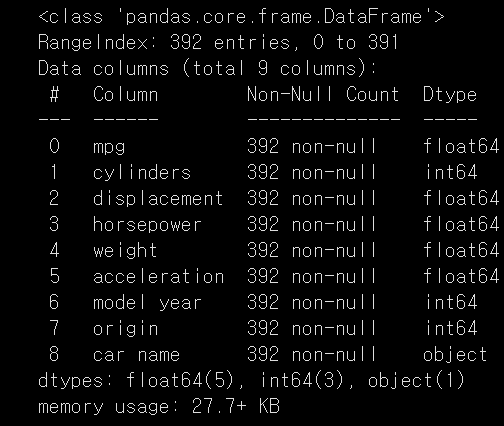 mpg_data.info()를 통해서 Data에 대한 정보를 살펴볼 수 있습니다.