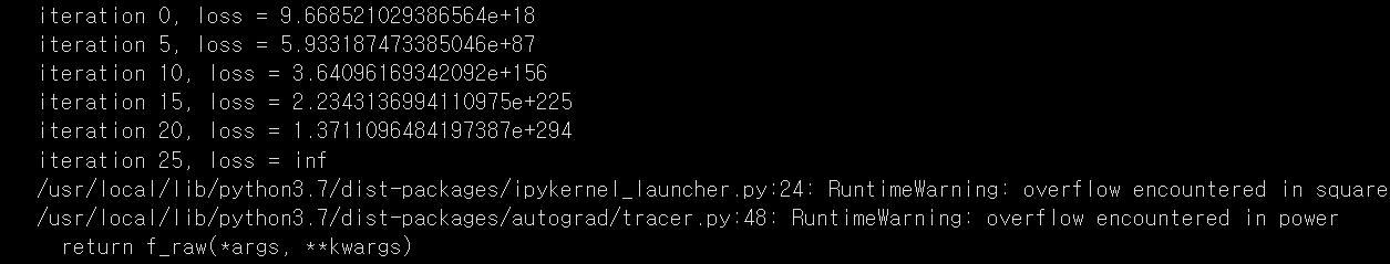 loss가 무한대를 넘어가서 오류가 발생했습니다.