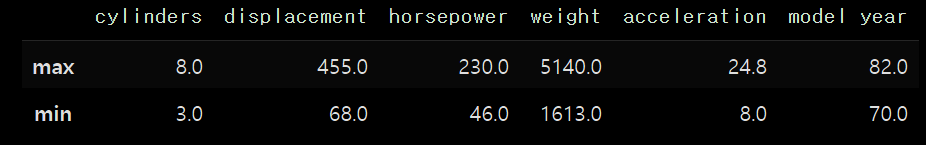 mpg_data[x_cols].describe().loc[['max', 'min']]