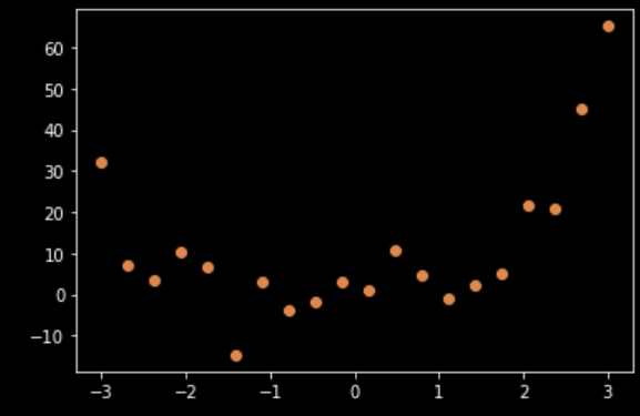 이렇게 생성한 데이터는 곡선의 형태이기 때문에 직선으로 표현하는데에는 무리가 있습니다.