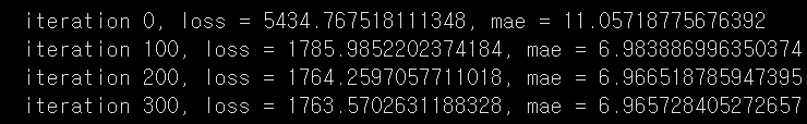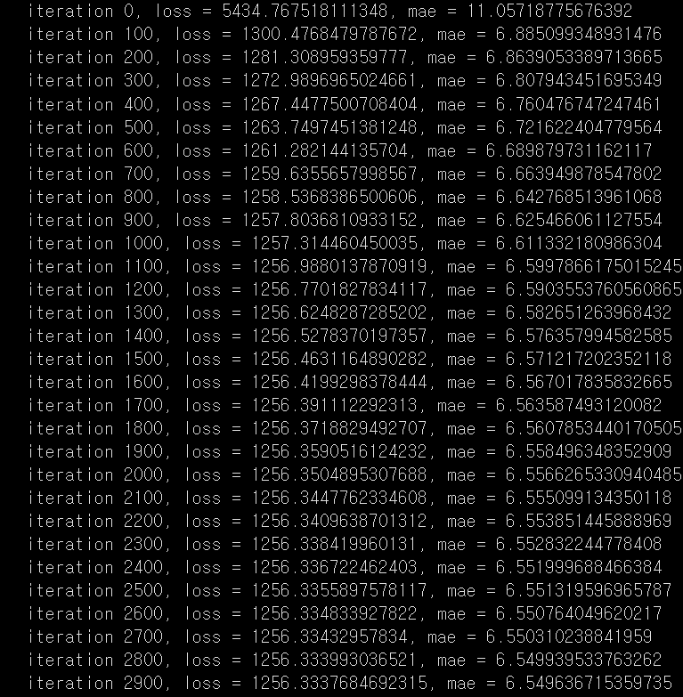 print("iteration {}, loss = {}, mae = {}".format(i, loss, mae))