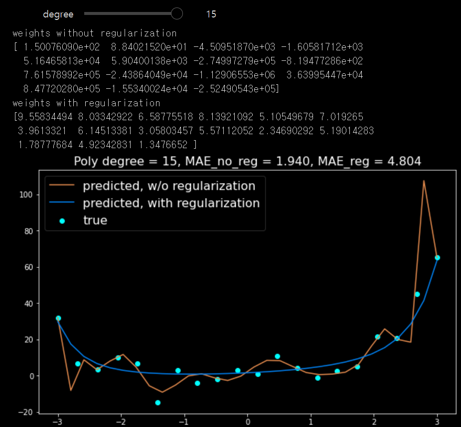 Degree가 커질수록 regularization의 중요성이 들어나게 됩니다. 이제 높은 차수에서도 예측 모델이 이리저리 움직이는 모습이 아닌 부드럽게 학습 데이터들을 지나가는 모습을 볼 수 있습니다. 이렇게 된다면 새롭게 들어오는 데이터도 잘 예측 할 수 있을 것입니다.