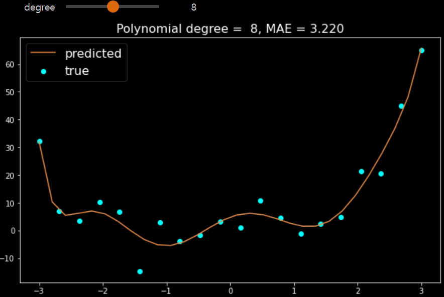 이제 차수(degree)를 높게 설정해봅니다. Training error인 MAE 값이 점점 감소합니다. 그러면 degree가 제일 큰 15가 MAE값이 가장 작으니까 제일 잘 맞는 모델일까요? 트레이닝 데이터만 본다면 맞습니다. 하지만 다른 데이터가 들어간다면? 적합한 모델이 아닙니다. 차수(degree)를 높일수록 모델은 곡선을 이루면서 모든 training point를 지나갑니다. 이로 인해 새로운 데이터가 추가된다면, 그 데이터가 모델 위에 있을 확률은 매우 희박하다는 뜻입니다.