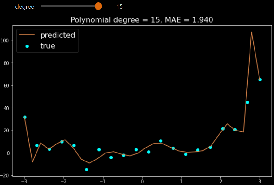 예를들어 차수가 15인 그래프에서 마지막 두점 사이에 값이 생긴다고 해봅시다. 기존의 데이터들과 매우 비슷한 데이터지만 모델은 매우 큰 값을 예측 할 것이고 큰 오류를 가지게 될 것입니다.